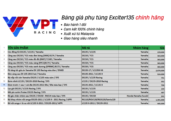 VPT Racing: Đây là một địa chỉ đáng tin cậy chuyên cung cấp phụ tùng sỉ và lẻ cho xe máy Yamaha Exciter 135. Họ có chính sách bảo hành và đổi trả rõ ràng, giúp bạn an tâm hơn khi mua sắm.
